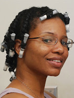 Since I sometimes use heat on my hair I can tell it still has lots of curl and shrinkage but is slightly more manageable than if I had skipped the heat altogether.  I tend to think that this factor has contributed to my success with roller setting lately.  The drying time is still the same but I can sometimes get away with using larger sections than I used to.  I thought maybe I would put my theory to the test by doing a ponytail roller set using only a few ponytail sections.  Instead of doing 4 ponytails down the middle (like a mohawk) and 4 more sections along the sides, I just used 4 large ponytail sections; 2 in front and 2 in back.  I then split each ponytail in half and rolled each section.  I also placed 2 individual rollers for the bangs.  My new method only took 4 ponytails and 10 rollers which is much easier and still gave me great results.